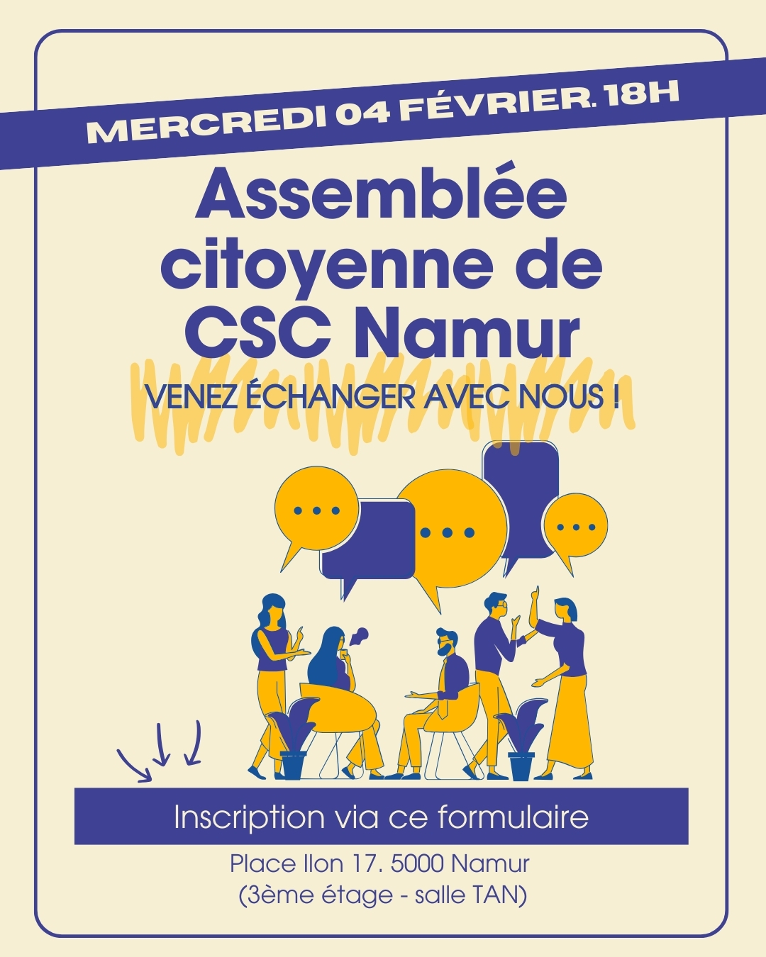 La CSC Namur-Dinant a donc le plaisir de vous inviter à une deuxième assemblée citoyenne, qui se tiendra le mercredi 4 février 2026, de 18h à 20h dans la.