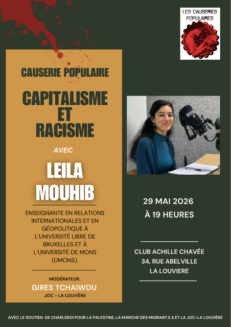 Le 29 mai à 19h, Les Causeries Populaires, Charleroi pour la Palestine, La Marche des Migrant.e.s et la JOC de La Louvière organisent une conférence sur le lien entre capitalisme et racisme avec Leila Mouhib, enseignante en relations internationales et en géopolitique à l’ULB et Umons.